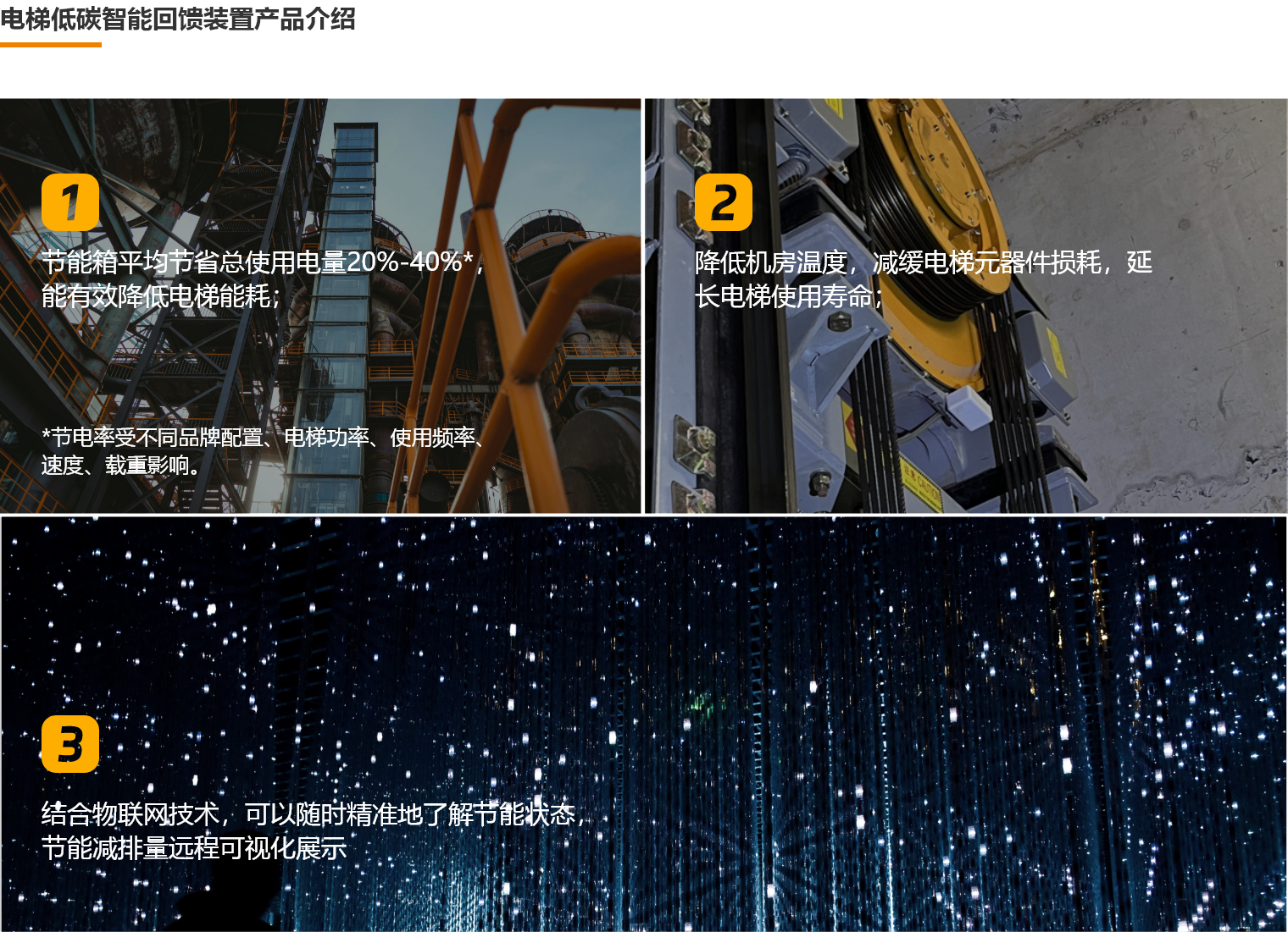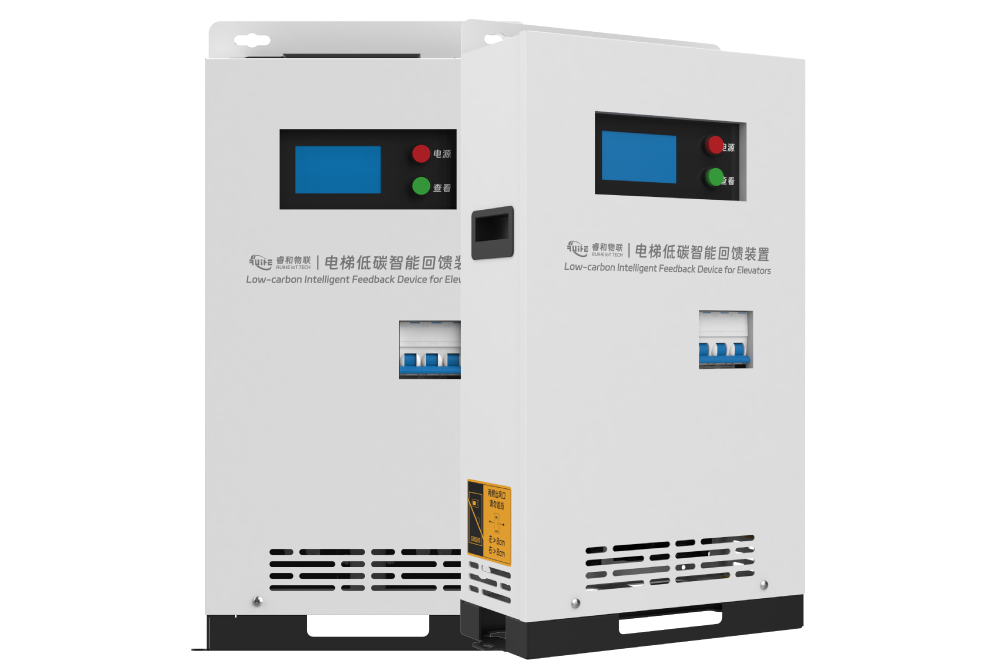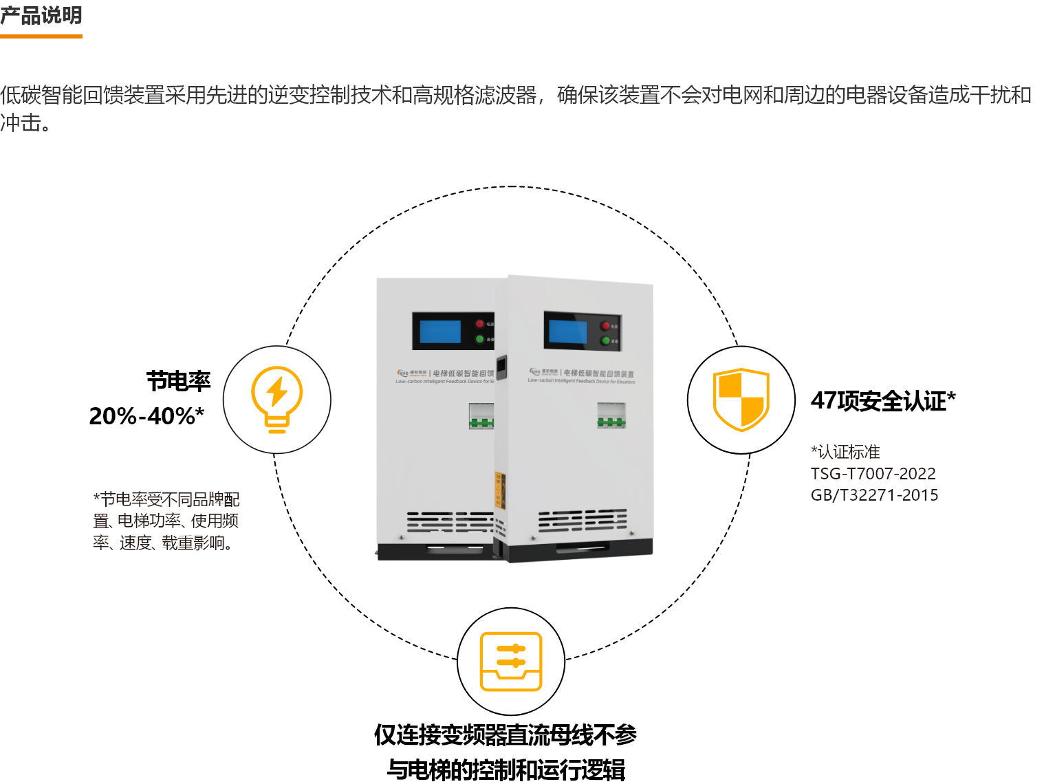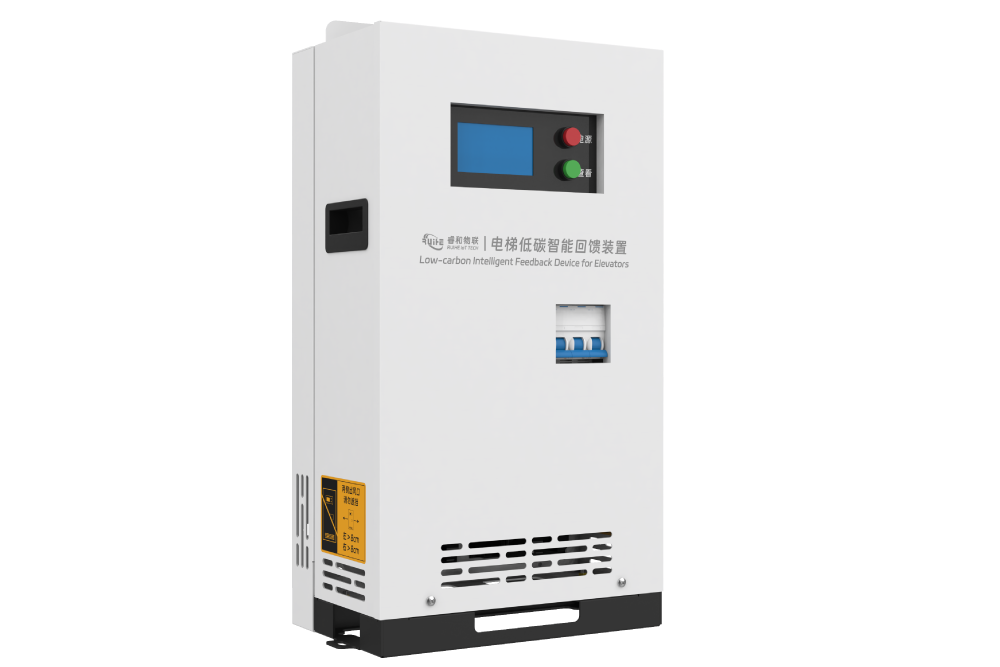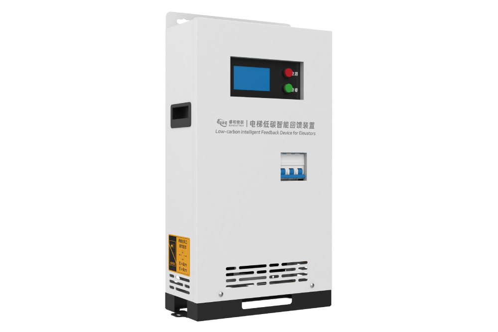 电梯低碳智能回馈装置自动检测电梯变频器直流侧母线电压,将变频器产生的直流电能回收、整流、逆变、滤波后形成与电网同频同相的交流电,并回馈到局域电网中,供周边设备用电,从而达到节能减排的目的。
